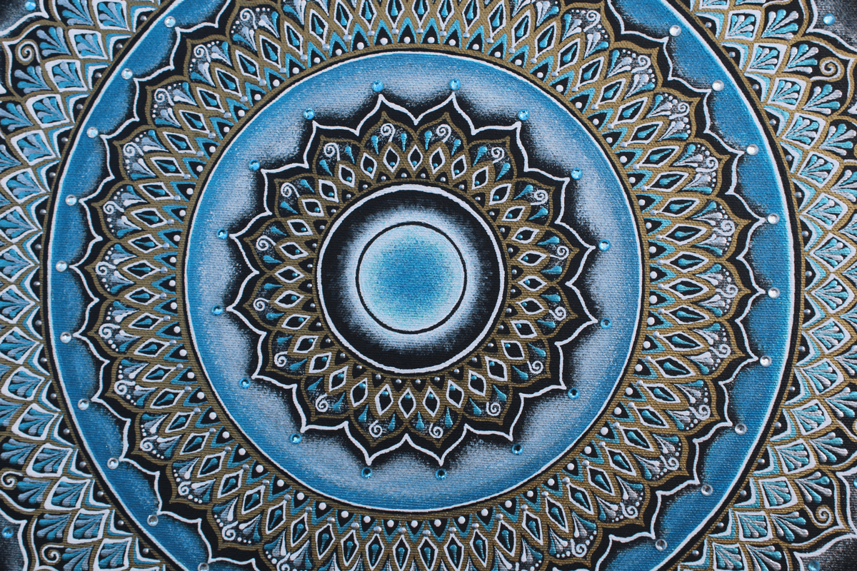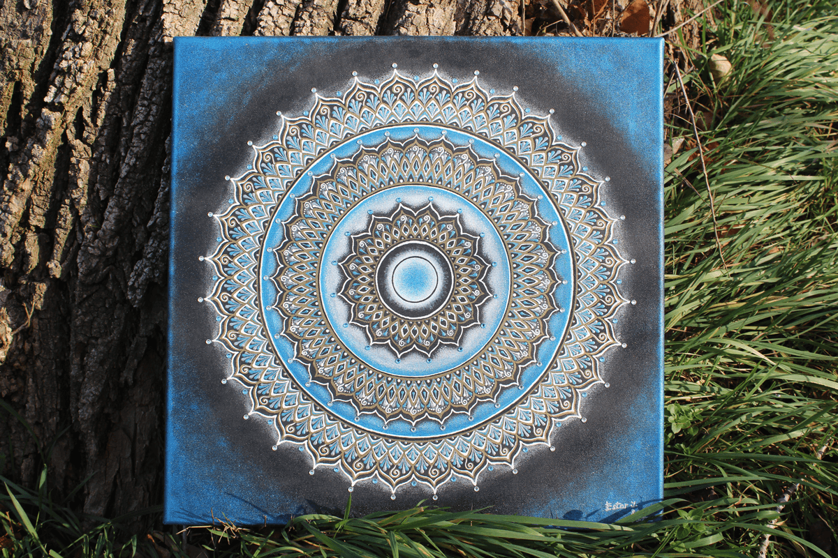 Obraz s názvem „Měsíční záře“ o rozměrech 50×50 cm zobrazuje mandalu v elegantních odstínech modré a zlaté. Malována je akrylovými metalickými barvami na kvalitním plátně, což jí dodává jemný lesk a hloubku. Mandala je zdobena drobnými kamínky a zafixována závěrečným lakem pro trvanlivost a ochranu.